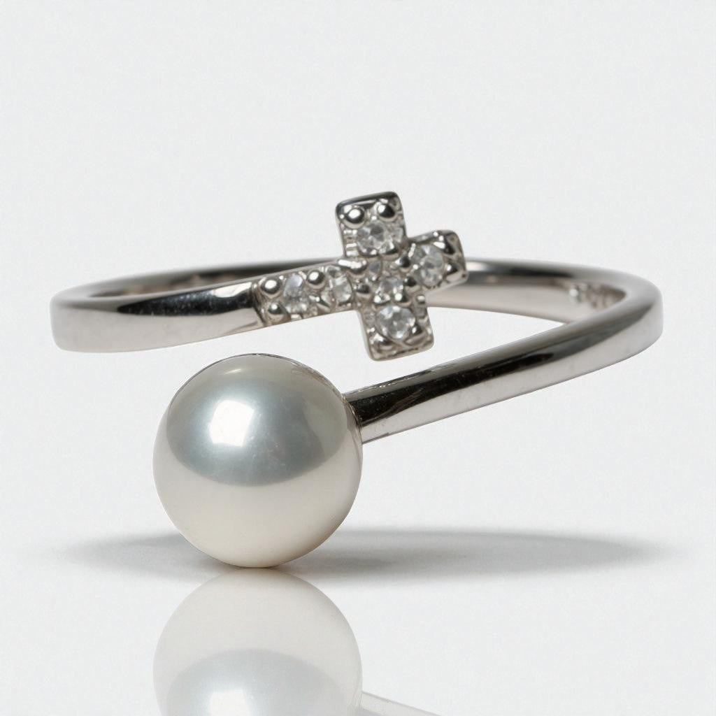 925 Sterling Silver Adjustable Cross Pearl Ring.