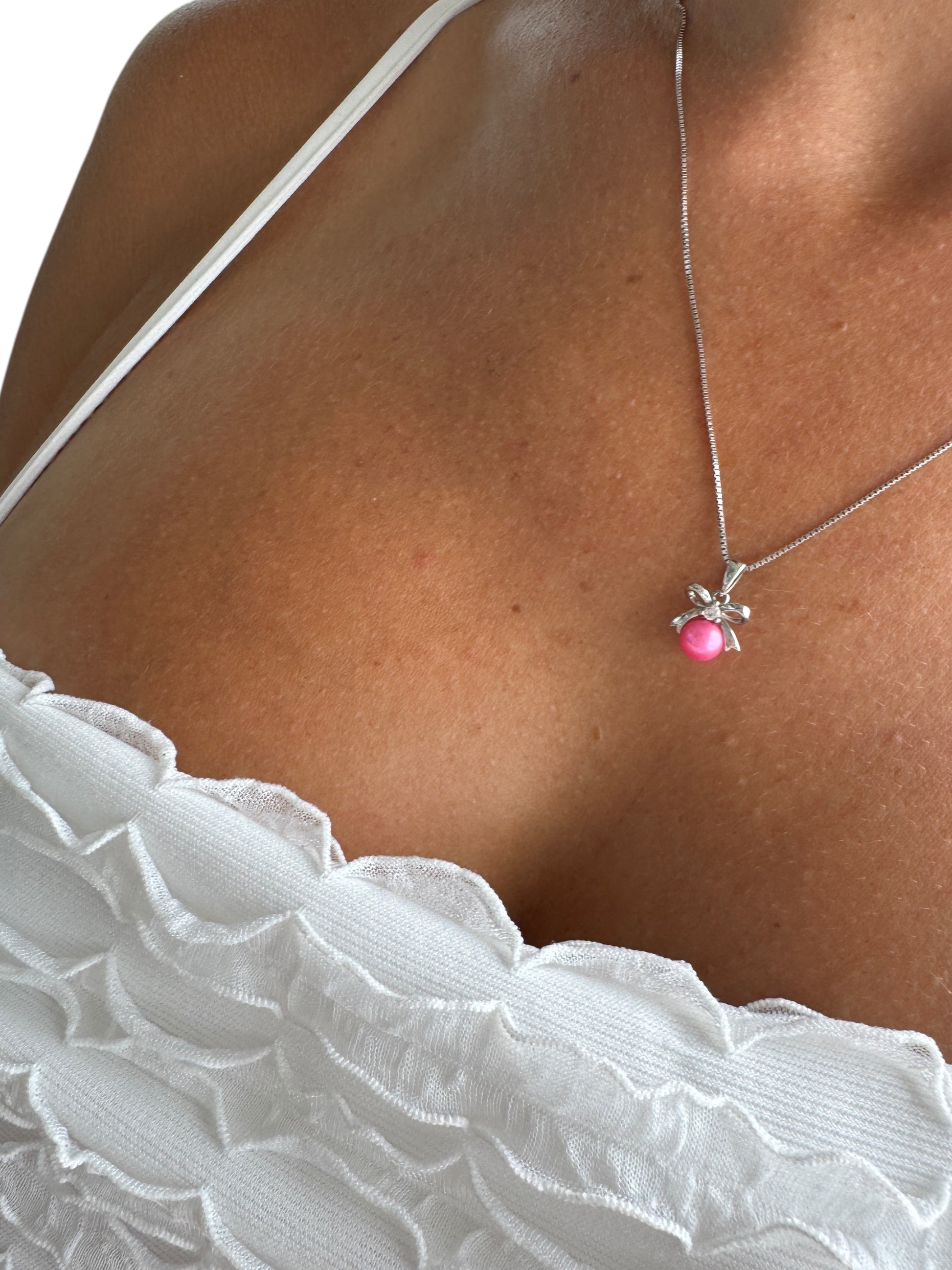Elevate your look with this elegant 925 Sterling Silver CZ Bow Pendant Pearl Necklace. Perfect for any occasion, this necklace allows you to add a personal touch with your choice of pearls. During our live event, we’ll reveal your surprise pearl color, choose from your pearl vault or you can choose from the available color palette below.
