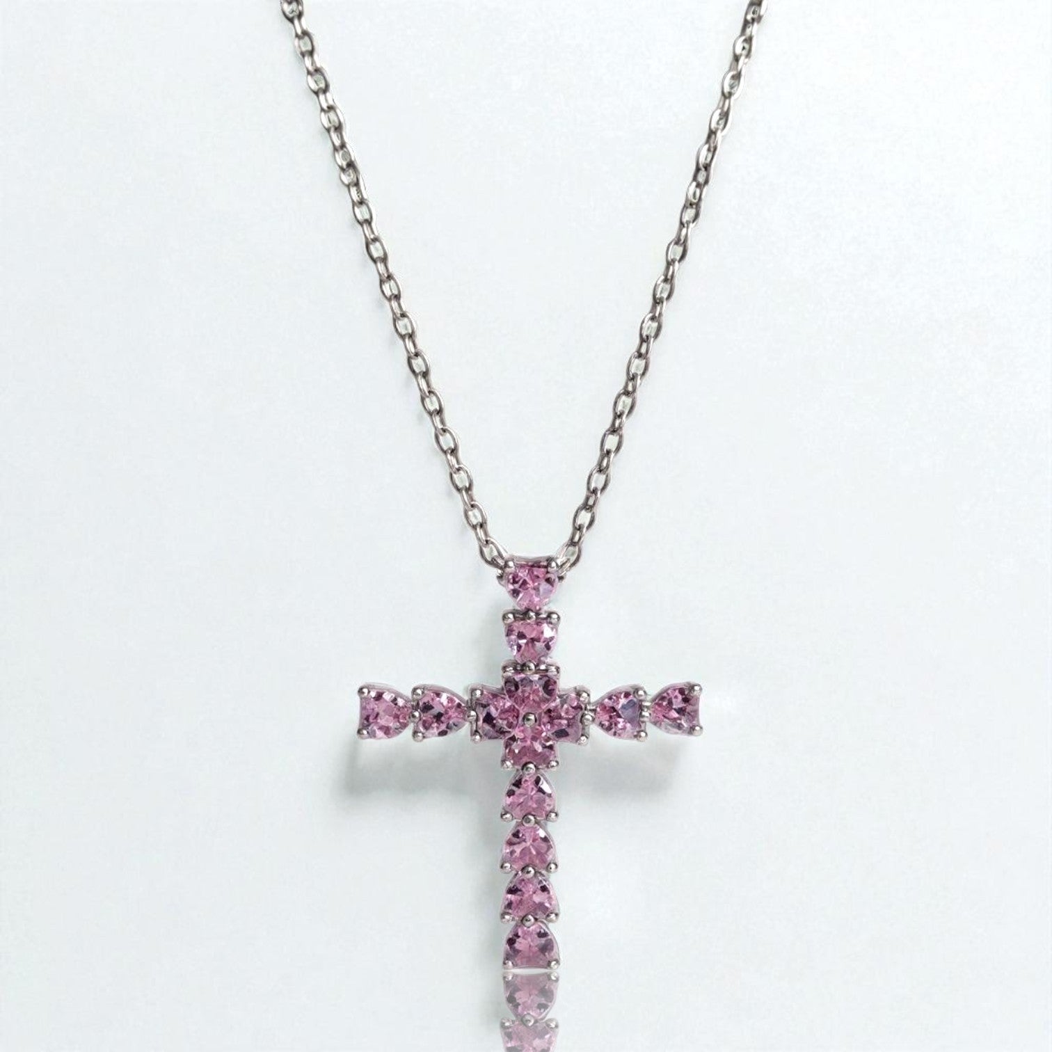 925 Sterling Silver Pink CZ Cross Pendant Necklace